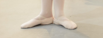 Place your feet next to each other on the floor parallel to each other. (What my teacher used to call sixth position.) Lift up your toes and rotate both legs out from the top of your hip and put them down. Now your heels are together and your toes are apart. This is first position. Do you feel work in your hips rotating to keep your feet in this position? That’s good! Your turn out comes from your external rotator muscles deep in your hips–not from your feet! Maybe your feet are closer to a 90 degree angle than the 180 “perfect turnout” that you’ve heard of. Don’t worry–and don’t move your feet! The only way to get better is to start where you are. If you force it, you may injure yourself.