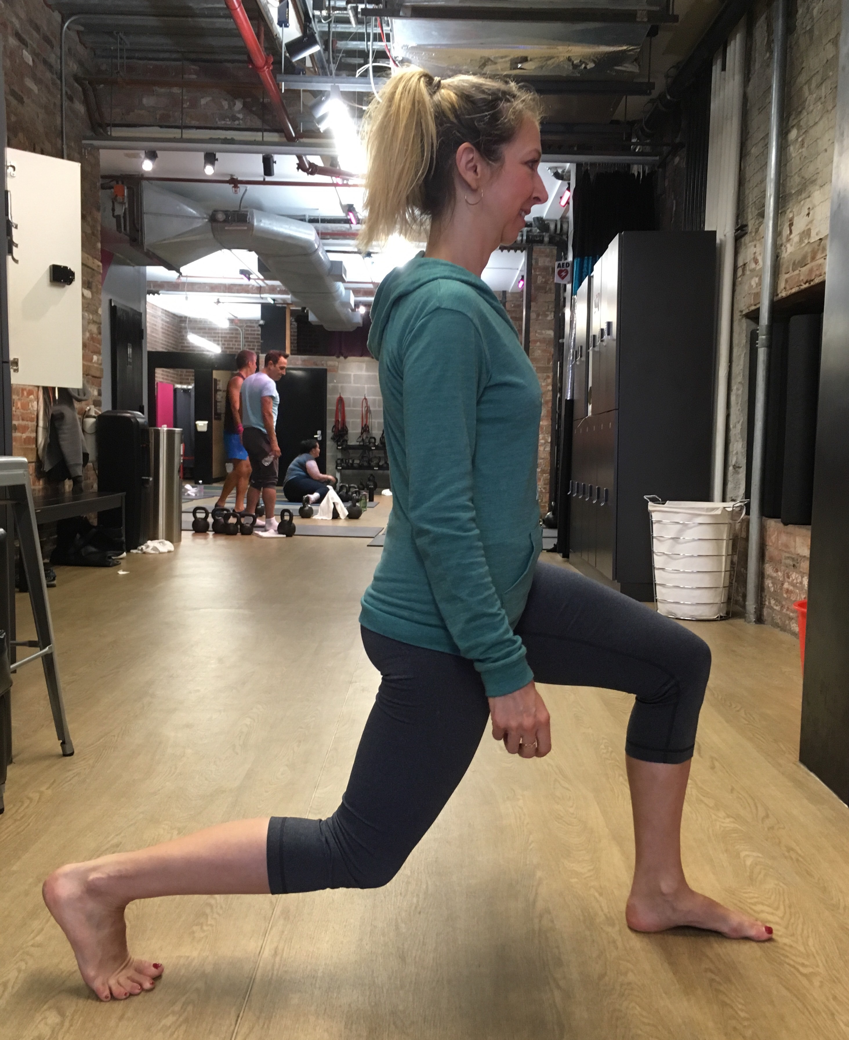 One move I learned recently at my gym is particularly effective at strengthening legs. It is called the split squat jump. You start in a lunge with your front leg and back leg bent at right angles. Like this: